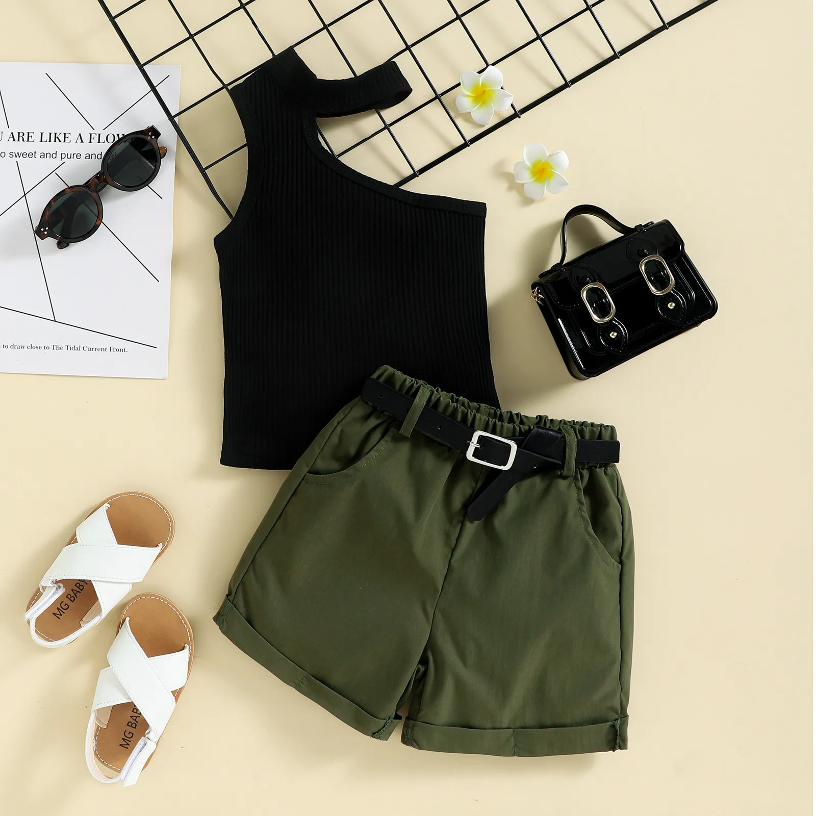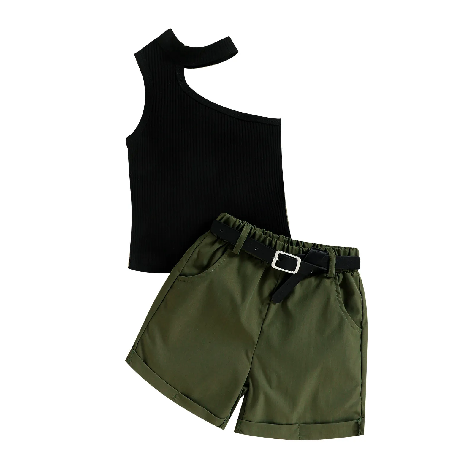 Summer Girl Ins Shoulder Halter Sunken Stripe Top Shorts Suit