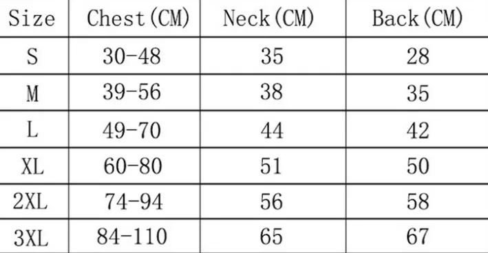 Specifications: (L*W) S collar 35 busts 30-48 back length 28, M collar 38 busts 39-56 back length 35, L collar 44 busts 49-70 back length