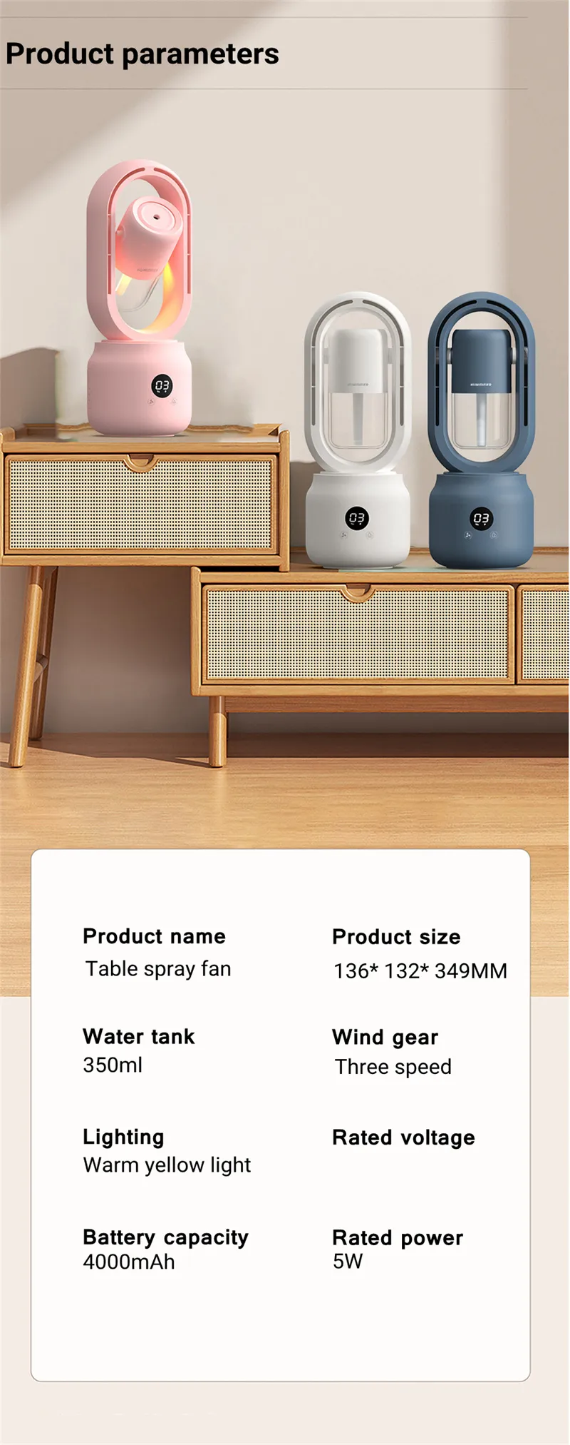 3. With 350ml air humidifier function, continuous and intermittent spray modes adjustment;