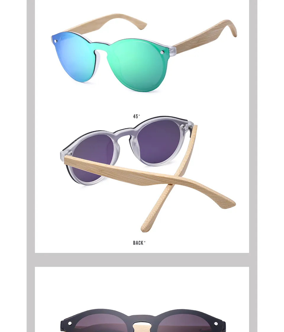 These sunglasses showcase lightweight bamboo frames that are sustainable, durable, and comfortable for long wear. The round lenses are enhanced with a color film coating, adding vibrant hues and reflective qualities that give a unique aesthetic while providing effective sun protection.
