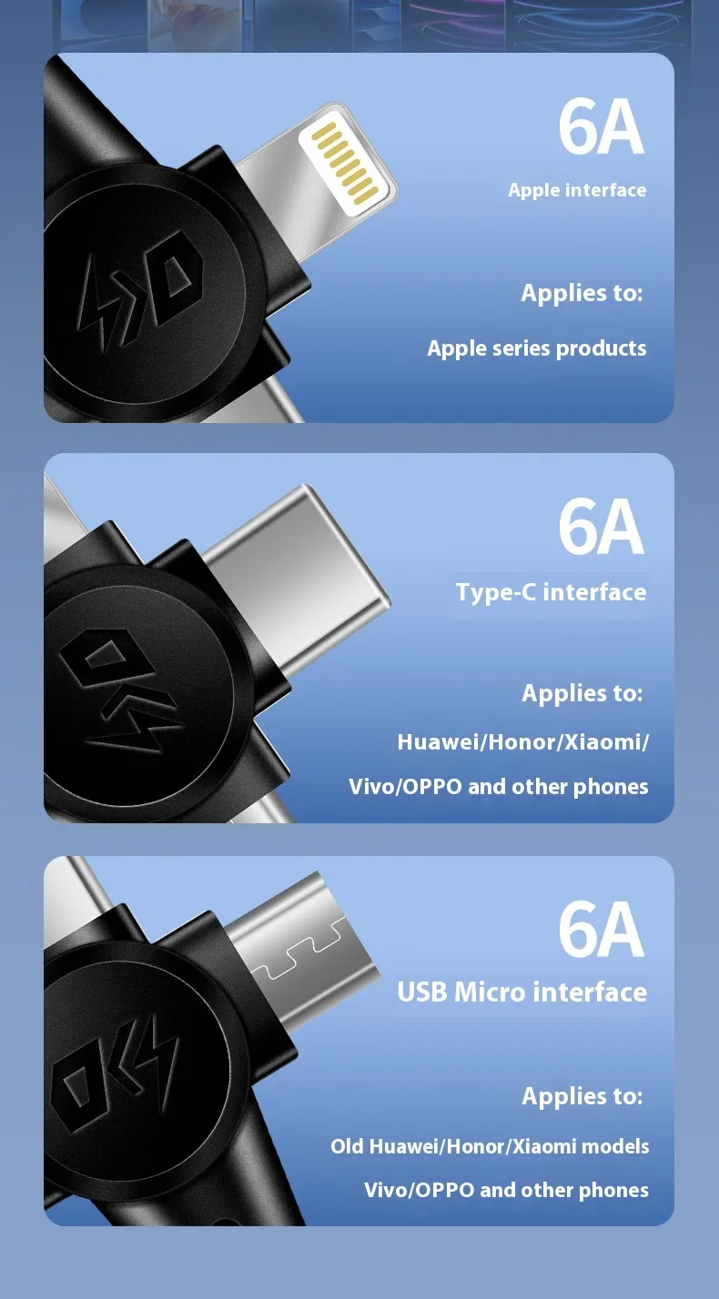 Experience the ultimate convenience with the Super Fast Charge Spring Telescopic Data Cable. This innovative three-in-one cable supports Type-C, Android Micro-USB, and Lightning devices, allowing you to charge multiple devices simultaneously without needing multiple cables. Perfect for New Zealand users with multiple devices at home, in the office, or on the go.