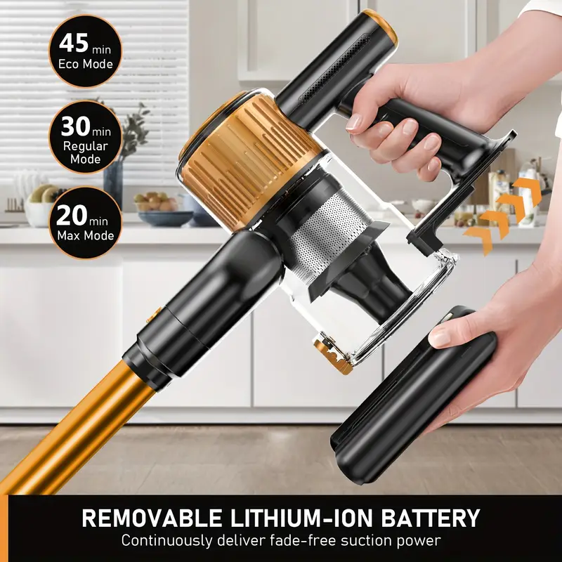 The SUXIANGVAC High Suction Power Home Vacuum Cleaner is a modern, rechargeable cordless vacuum designed for efficiency and convenience. With its anti-tangle brush and upgraded green light, this vacuum cleaner ensures optimal cleaning performance without the hassle of tangled cords. The vacuum provides 45 minutes of run time on a single charge, allowing you to clean large areas or multiple rooms without interruption.