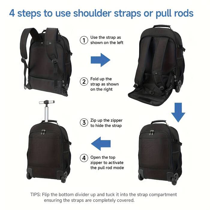 The roller backpack design features a retractable handle and wheels, allowing you to easily roll the bag when you're on the move. If you prefer carrying it on your back, the adjustable straps provide a comfortable fit, making it versatile for different travel scenarios.