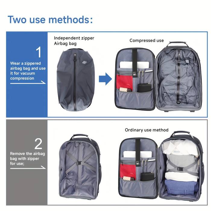 The built-in vacuum compression system helps to reduce the size of your packed items, making it easier to fit everything into your bag. This feature is perfect for packing more clothes or other items while keeping your luggage compact and easy to carry.