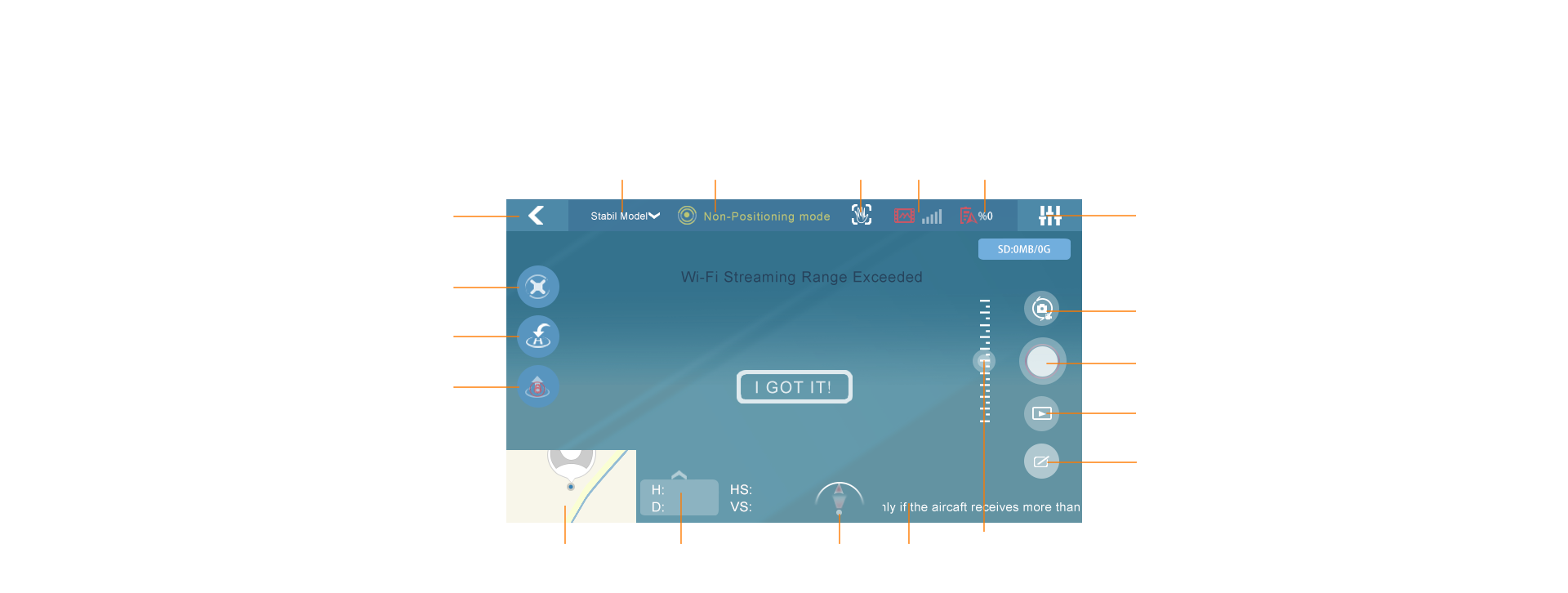 Waypoint:Under GPS mode, you can map a desired flight path with a set of specofoc point When the flight altitude is below 15m, aircraft will automatically rise up to 15m height before starting waypoint technology. (waypoint technology can only be functioned when the aircraft altitude is at or above 15m)