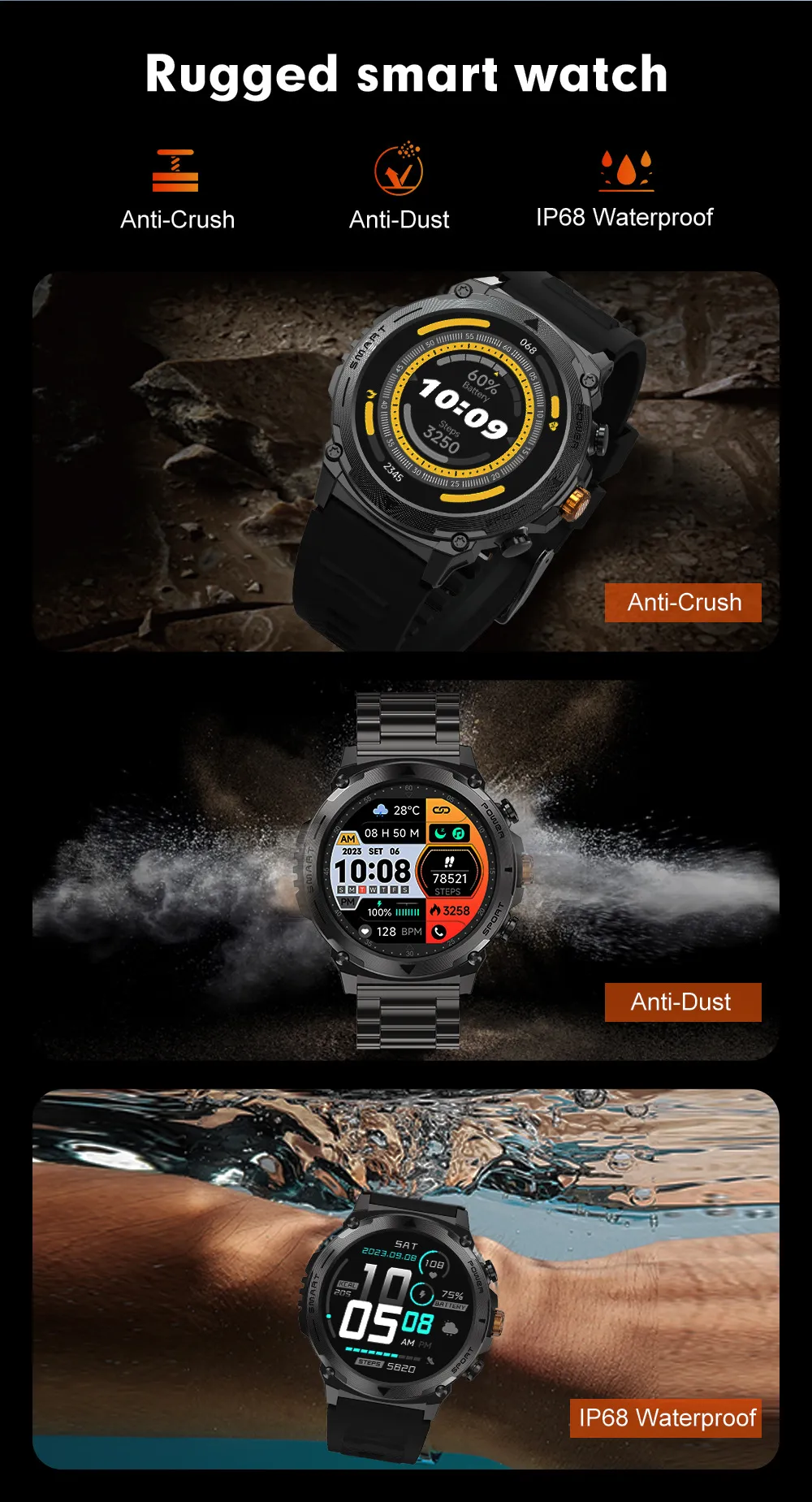 Built for outdoor activities, the T53 is equipped with a three-proof design—waterproof, shockproof, and dustproof—making it highly durable in tough environments. Whether you're caught in the rain, sweating through a workout, or exploring the wilderness, this watch is made to handle it all. With an IP68 water resistance rating, you don’t have to worry about water damage, even in heavy rain or during workouts.