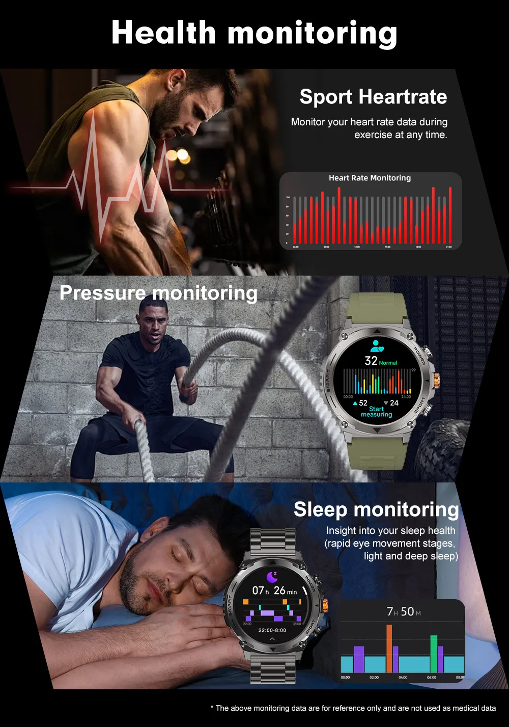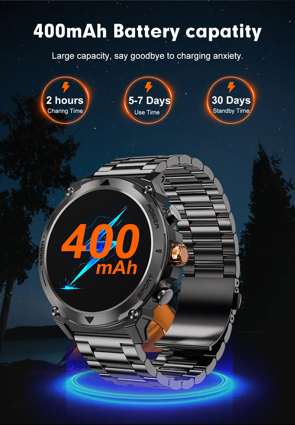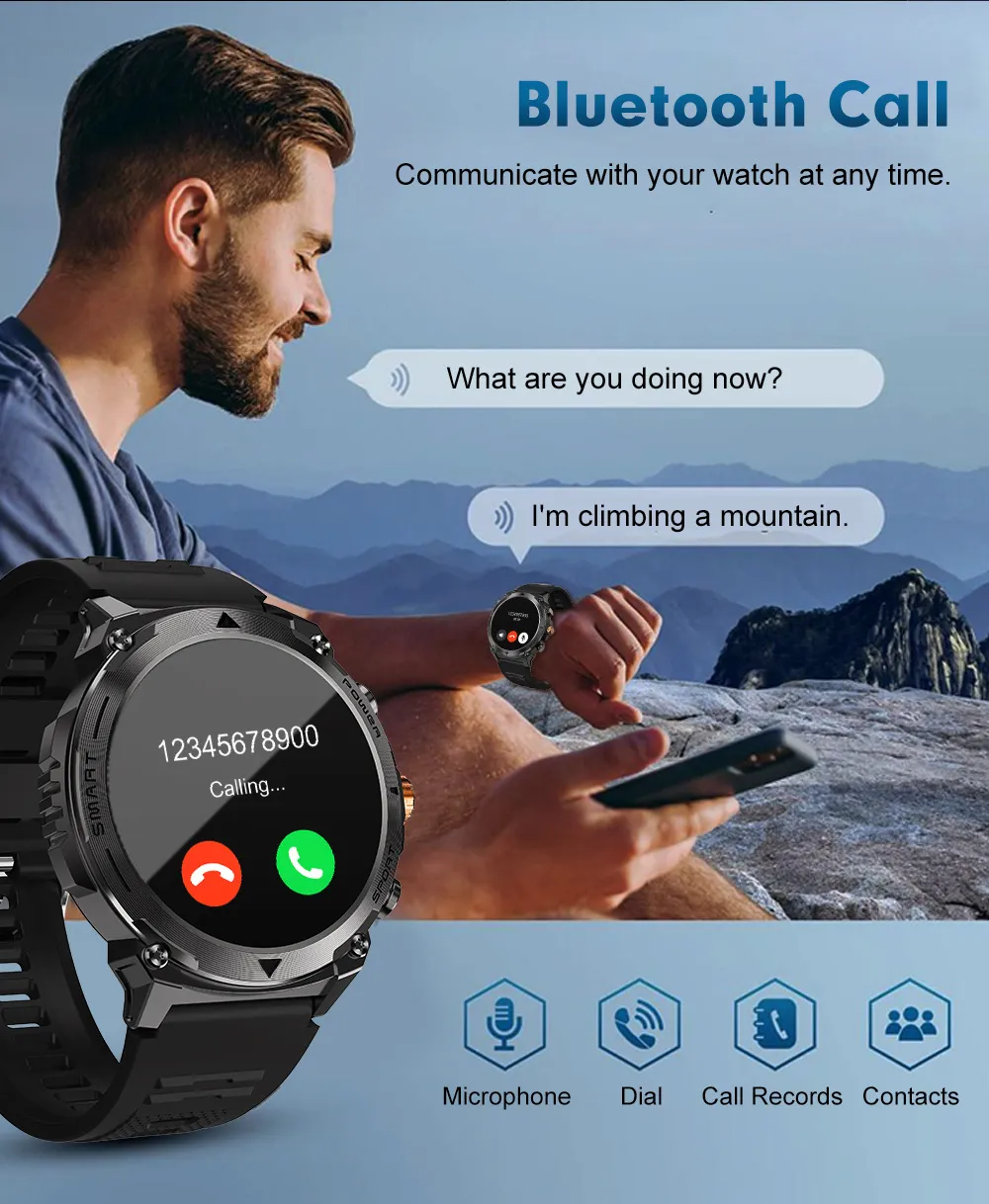 The T53 Bluetooth Calling Outdoor Three-Proof Sport Watch is designed for individuals who demand more than just a watch. This smart, multifunctional timepiece is perfect for sports enthusiasts, adventurers, and those who lead an active lifestyle. With a 1.43-inch AMOLED screen, Bluetooth calling, heart rate monitoring, and blood pressure tracking, the T53 offers both style and functionality. Whether you're hitting the gym, exploring the outdoors, or managing your health, this watch ensures you stay connected and on top of your goals.