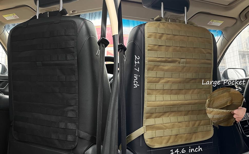 - Tactical Seat Covers Universal: The size of car seat back organizer is 21.7*14.6 inch. with adjustable strap can be easily installed around the bottom of the car seat headrest and seat back and base. Suitable for most vehicle seat back, SUV, truck, pickup, etc. After installation, it can be easily transferred from the set position to the seat position or from the vehicle to other vehicles, which is convenient for your travel