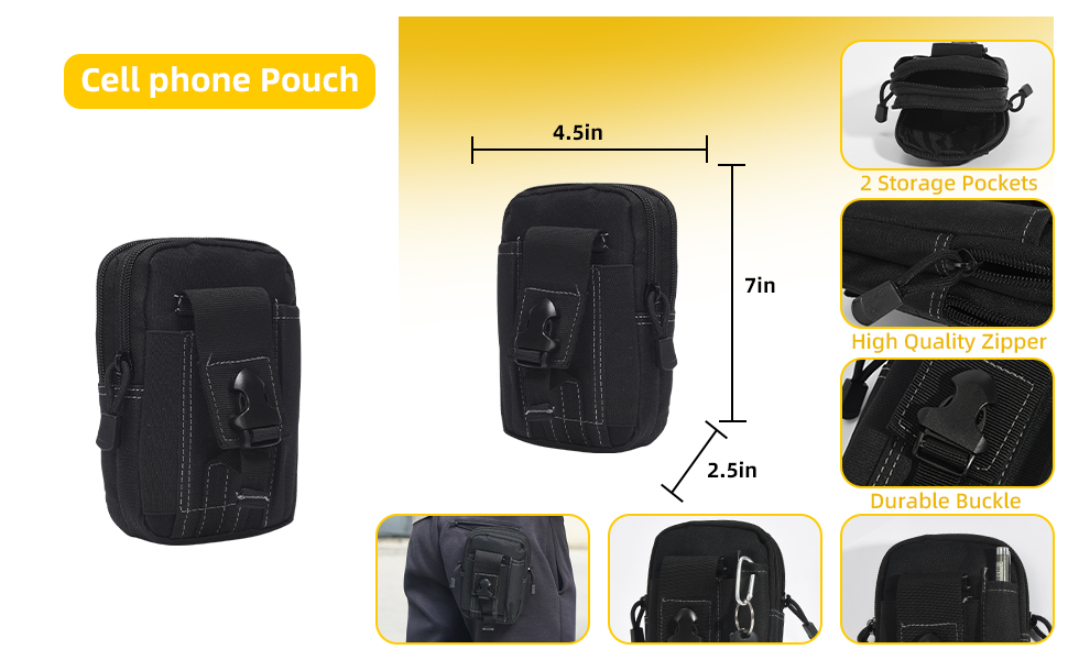 Tactical belt pouch designed features two zippered pockets , one cell phone pocket and pen sheath on the front. Is an ideal organizer for accessories, cell phone, key chain, wallet, tools, and everything else you need readily accessible