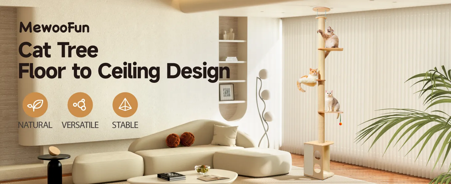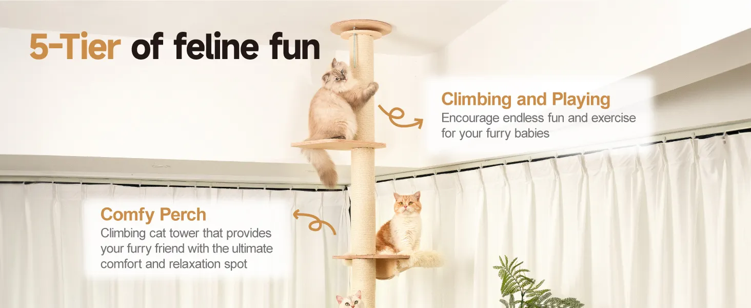 - Adjustable Floor to Ceiling Cat Tower: This cat tree maximizes vertical space, making it suitable even for compact areas. Its adjustable design accommodates ceilings up to 108 inches, satisfying cats' natural instincts to climb and perch high