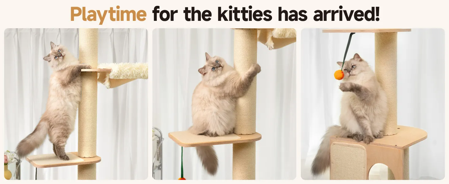 - 4-in-1 Cat Playground: With multiple tiers, this modern cat tree offers ample space for kittens to play and climb. Cats can enjoy the view from the highest perch, relax in the hammock, play with hanging toys on the platform, or explore the two bottom-level holes. Ideal for multi-cat households
