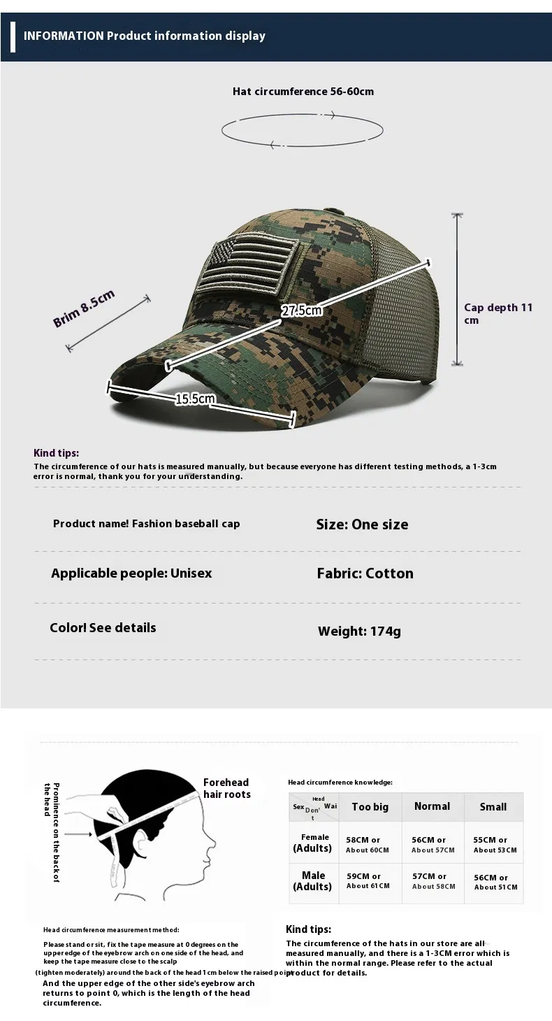 The Tear Mark Velcro Outdoor Sun Protection Tactical Camouflage Baseball Hat is the perfect blend of rugged functionality, tactical design, and outdoor style. Designed for outdoor enthusiasts, adventurers, and tactical professionals, this baseball cap offers excellent sun protection while providing a distinctive camouflage design. Featuring a Velcro strap for a customizable fit and a durable tear mark design, this hat is ideal for hiking, camping, hunting, or any outdoor activity where both protection and performance are required. Stay cool, comfortable, and shielded from the sun with this versatile cap.
