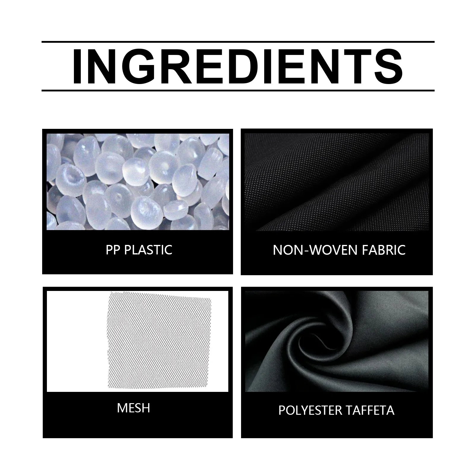 Material: PP plastic, non-woven fabric, mesh, polyester taffeta