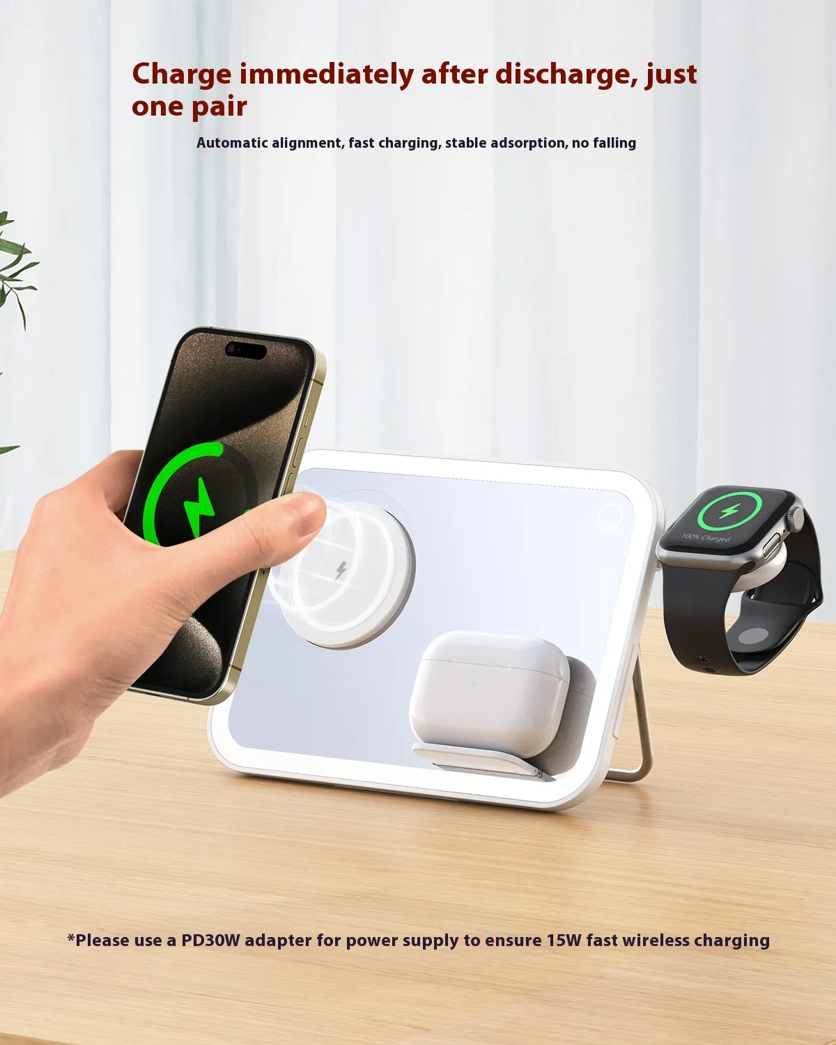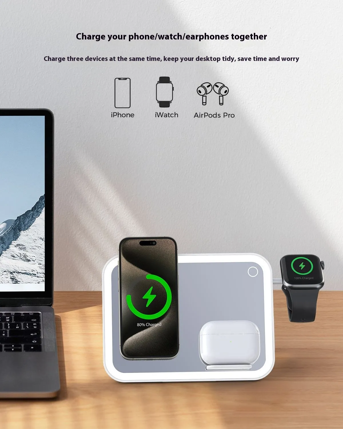 Three-in-1 Wireless Charging Pad: Qi-enabled wireless charging allows you to charge your smartphone,