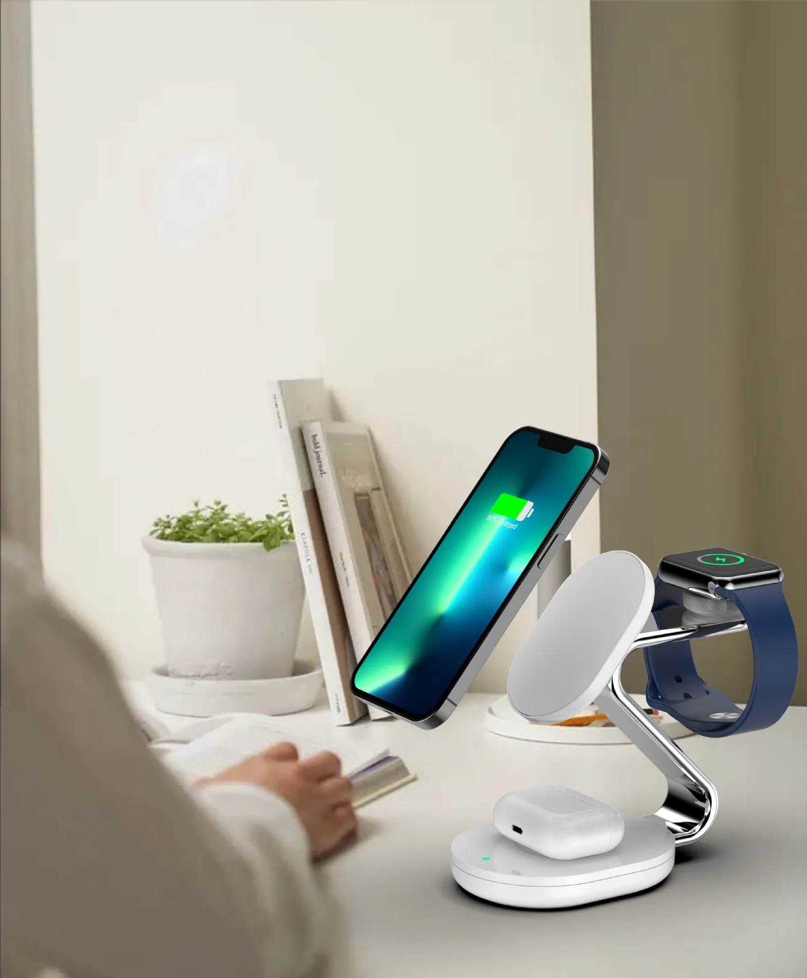 The Three-in-One Magnetic Wireless Charger is the ultimate solution for simplifying your charging routine. Designed to charge your iPhone, Apple Watch, and AirPods simultaneously, this magnetic wireless charger provides convenience and efficiency with its sleek design and powerful functionality. Say goodbye to multiple chargers and cables cluttering your workspace and welcome a tidy, all-in-one charging station.