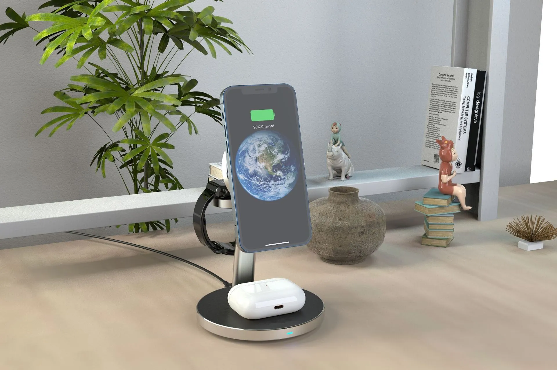 who rely on their iPhone, Apple Watch and wireless earbuds every day, it combines three charging stations into one sleek magnetic stand.