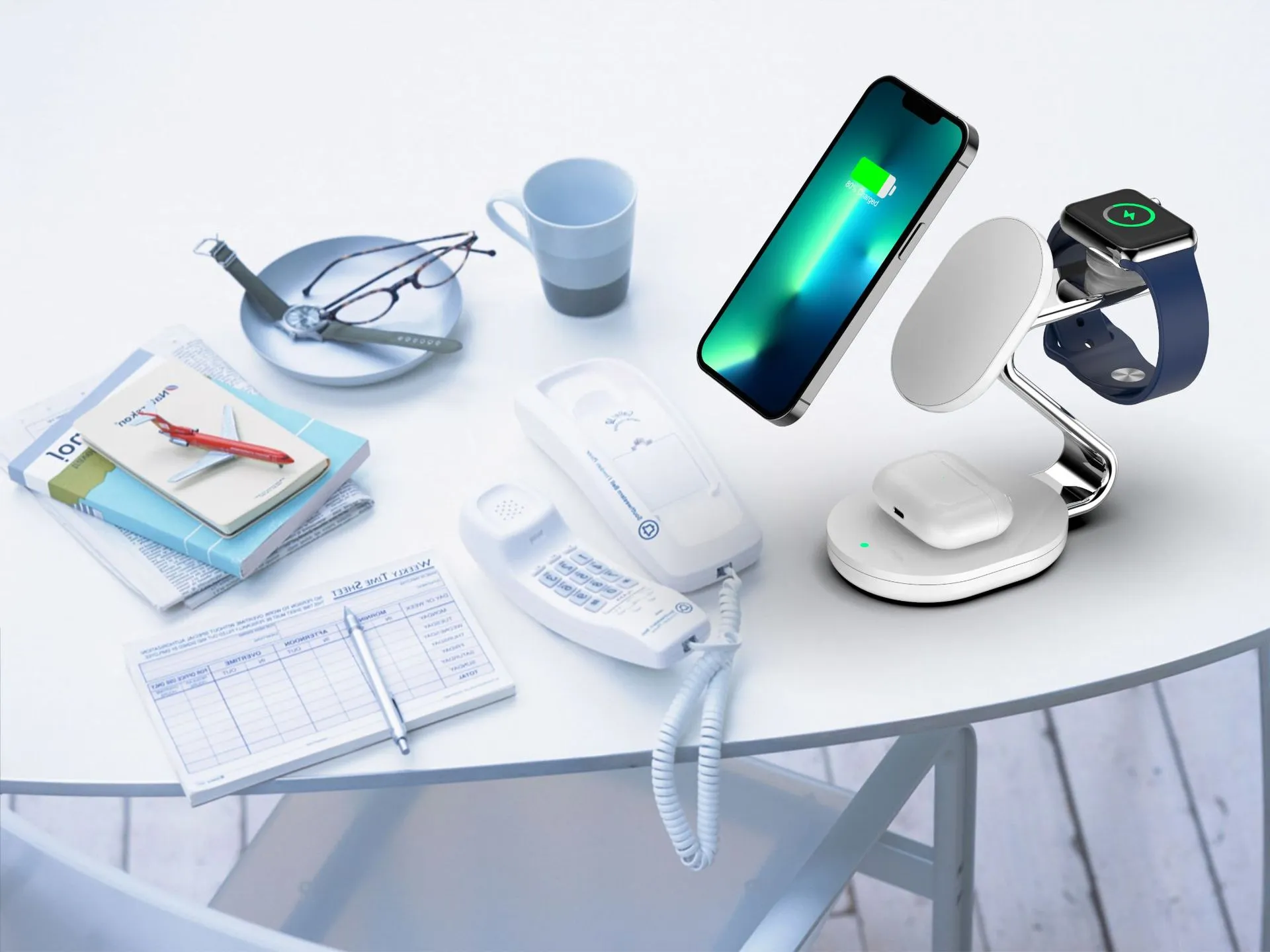 The sleek, modern design of the Three-in-One Magnetic Wireless Charger blends seamlessly with your home or office decor. Its compact size ensures it doesn’t take up much space, and it’s perfect for use on your desk, nightstand, or in your living room.