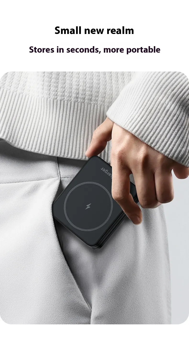 Equipped with magnetic alignment, the charger ensures secure and precise placement for fast wireless charging. Its foldable design makes it portable and ideal for travel, while maintaining a sleek and modern appearance suitable for any desk or bedside table.