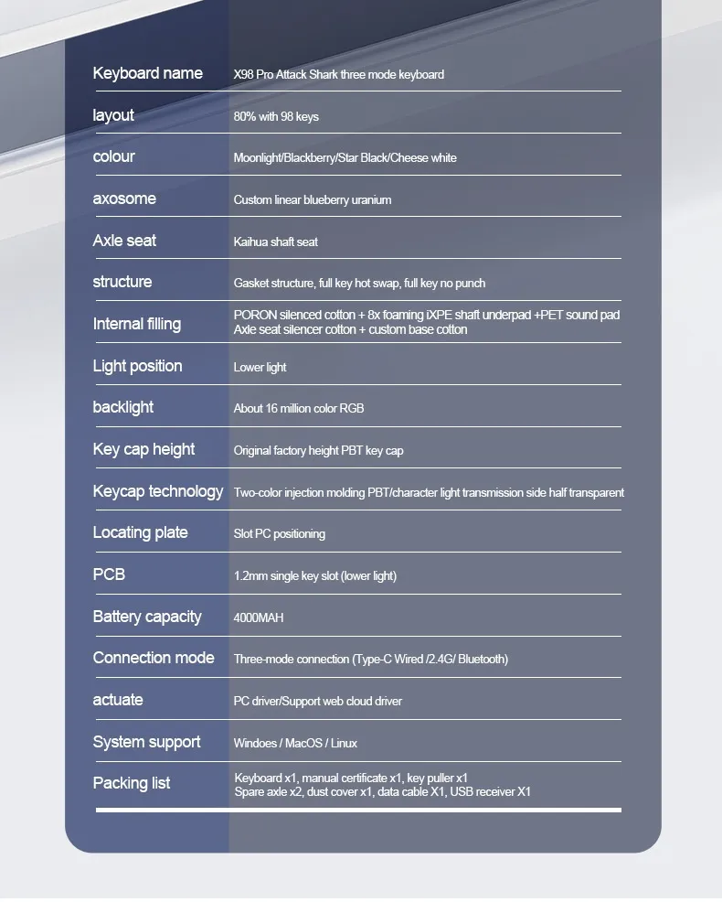 Attack shark X98PRO three-mode RGB keyboard moonlit blueberry axis,
