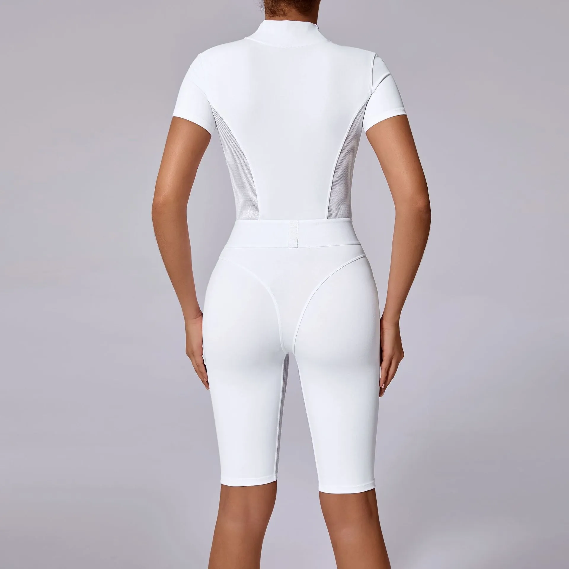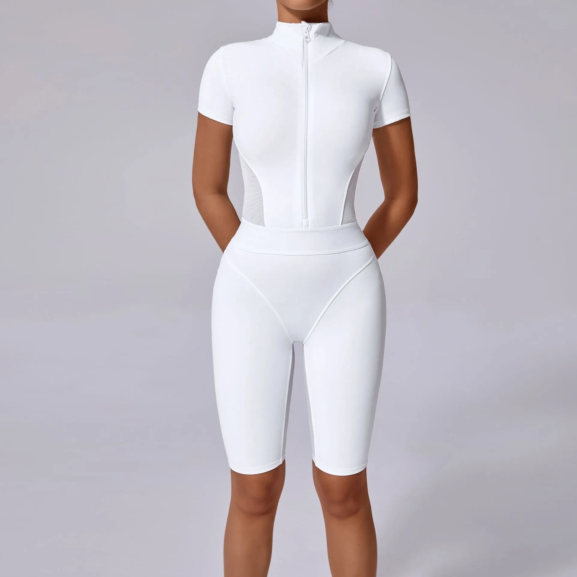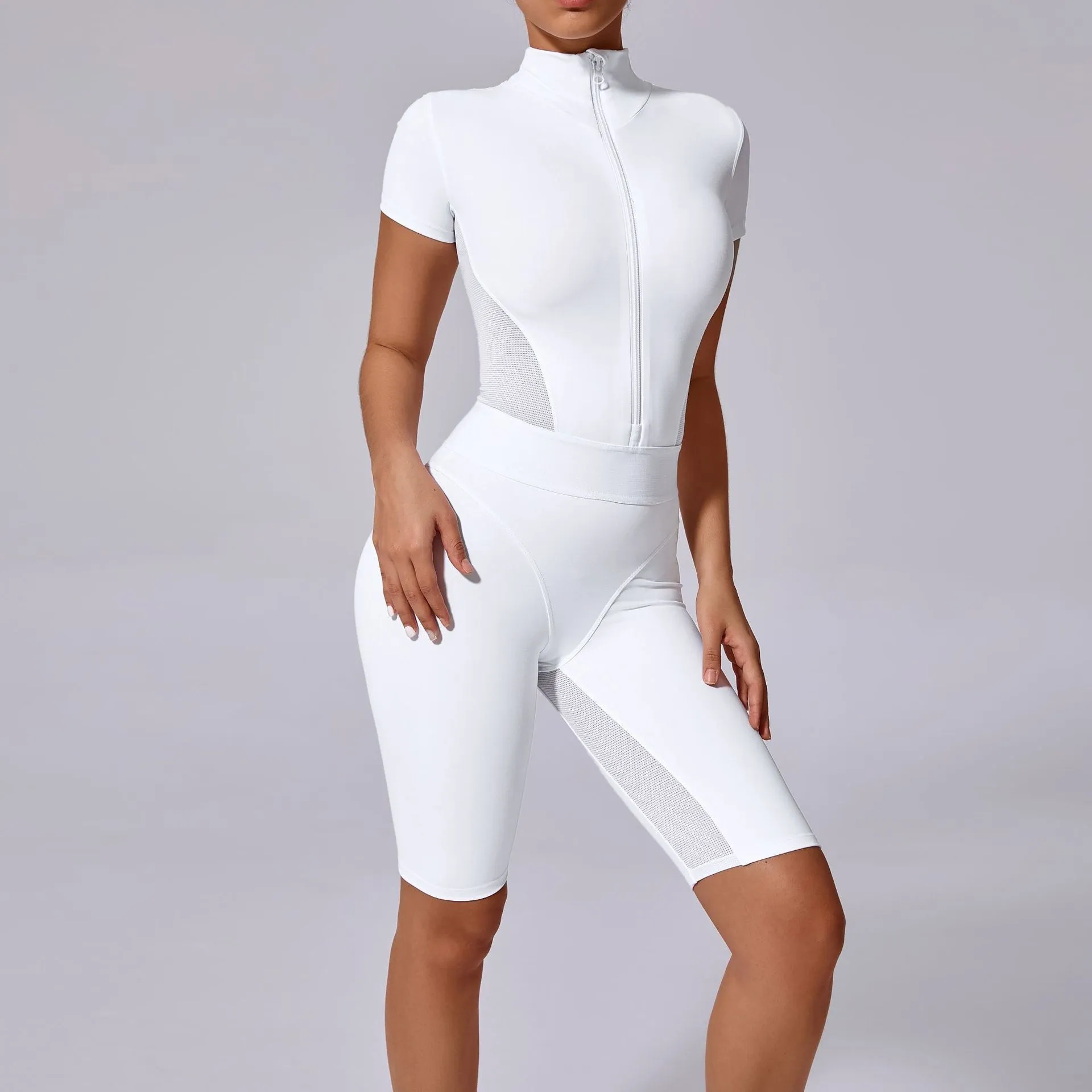 SEO Keywords: yoga jumpsuit, short sleeve jumpsuit, open collar jumpsuit, zipper jumpsuit, tight waist jumpsuit, women’s activewear, form-fitting jumpsuit, stylish yoga jumpsuit, breathable jumpsuit, comfortable jumpsuit.