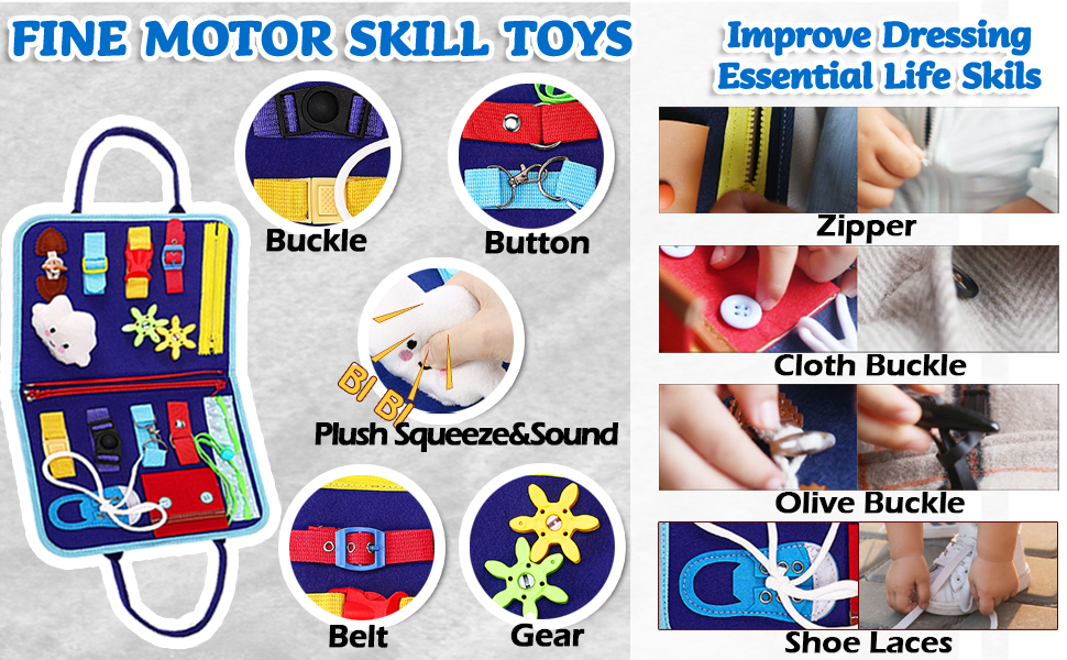 - [PLAY WHILE LEARNING] - Keep your toddler entertained while they develop essential skills like dressing at their own pace, improving fine motor skills and finger dexterity. The Octopus button page help improve hand eye coordination. Clock, calendar and season weather page is for cognitive skill. Shape matching page and fun jigsaw puzzle improve recognition and imagination. Toddler can learn spelling and numbers through the hook&loop letters board and interesting number threading game. WARNING: CHOKING HAZARD -- Small parts. Not for children under 3 yrs.