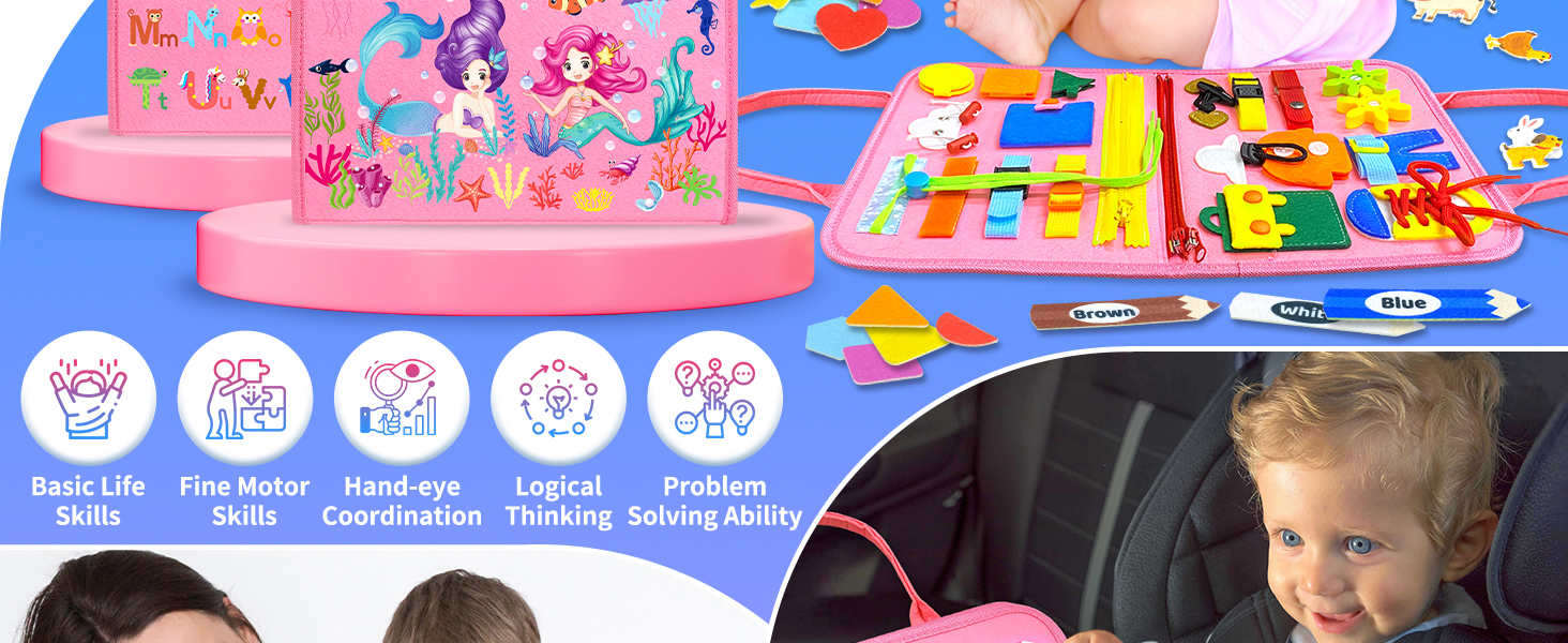 - Endless Fun Learning Toy: This busy book for toddlers is based on Montessori education theory to design, helping children to develop a lot of skills, including basic life skills, fine motor skills, hand-eye coordination, thinking ability and problem solving ability, etc. Your little loved ones will have countless entertainment while playing this colorful activity board!