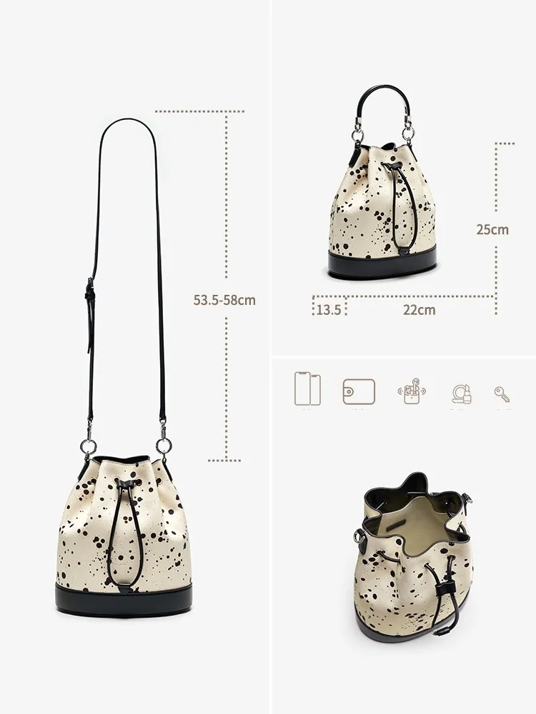 The standout feature of this bucket bag is its use of top layer cowhide leather. Known for its rich texture and natural grain, this leather ages beautifully, becoming softer and more luxurious over time. The genuine leather construction ensures that this bag is not only stylish but also built to last. The leather is soft to the touch yet durable enough to withstand daily wear, making this handbag a reliable companion for years. The smooth texture and high-quality finish enhance the overall aesthetic, giving the bag an elegant, high-end look that is perfect for the modern woman.