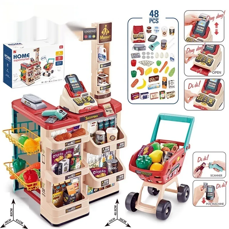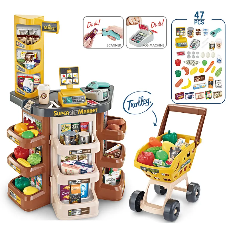 Children can set up aisles, label prices, scan items, total purchases, and handle pretend money—mirroring real supermarket experiences.
