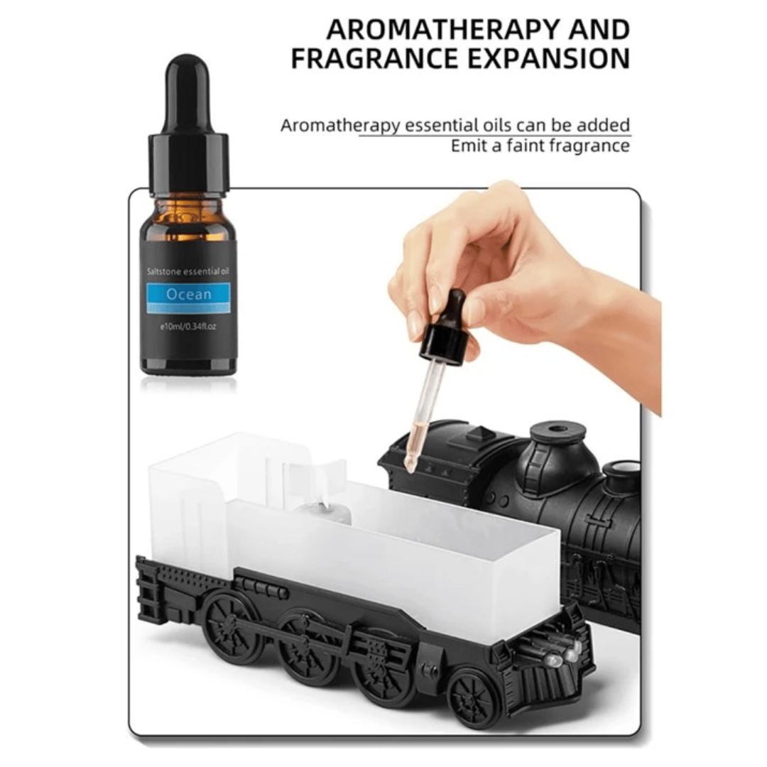 diffuser combines the functionality of an essential oil diffuser with the whimsical design of a steam engine train, making it a perfect