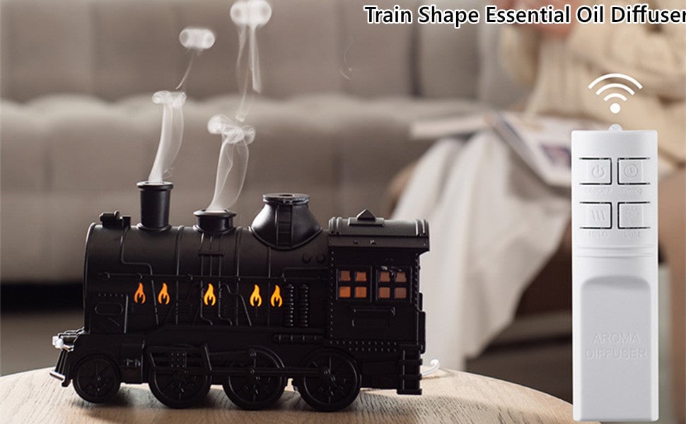 - LOCOMOTIVE SHAPED ESSENTIAL OIL DIFFUSER: This train diffuser combines retro style with functionality; It’s a humidifier, aromatherapy diffuser, and night light with blue and flame-colored lights; Can relieve physical discomfort caused by dry air
