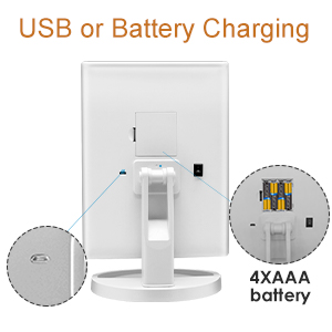 - Dual power supply modes:Operated by Micro USB cable supply or 4AAA batteries( battery not included, usb wire included) , pls noted the mirror can't store power by itself, you can't charge the batteries too.