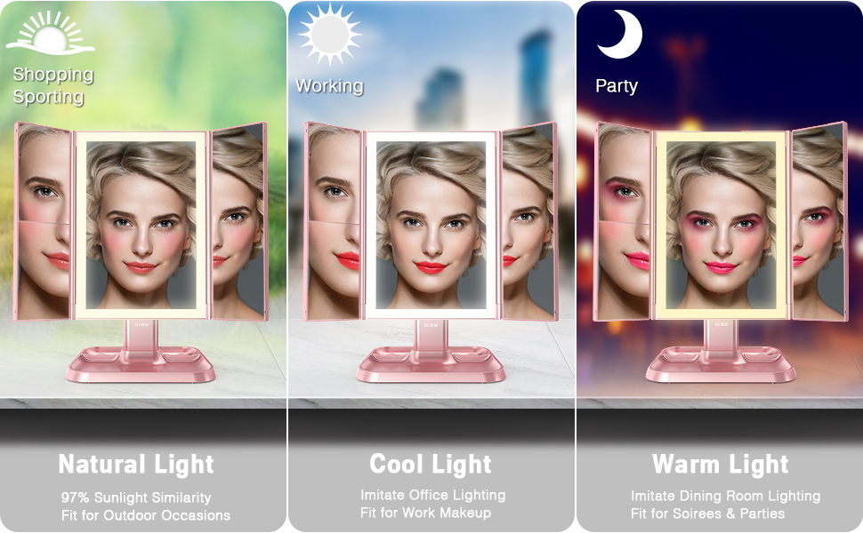 - 【Optional Warm, Cool, & Neutral Lights】We chose the most frequently used lights in light designing—warm, cold, and natural light. You can apply either light or heavy makeup for any occasion perfectly: the warm light fits for soirees; the natural light has 97% of sunlight similarity and fits for outdoor occasions; the cool light fits for office makeups. From now on, say goodbye to wrong lights and imperfect makeup!