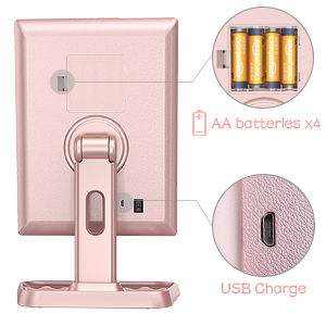 - Dual power supply; makeup mirror with lights powered by USB charging cable or 4xAAA batteries; USB cable included, Charger and batteries not included