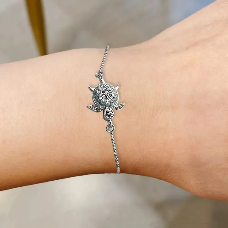 Crafted with care, this bracelet features a beautifully detailed sea turtle charm adorned with shiny rhinestones that catch the light with