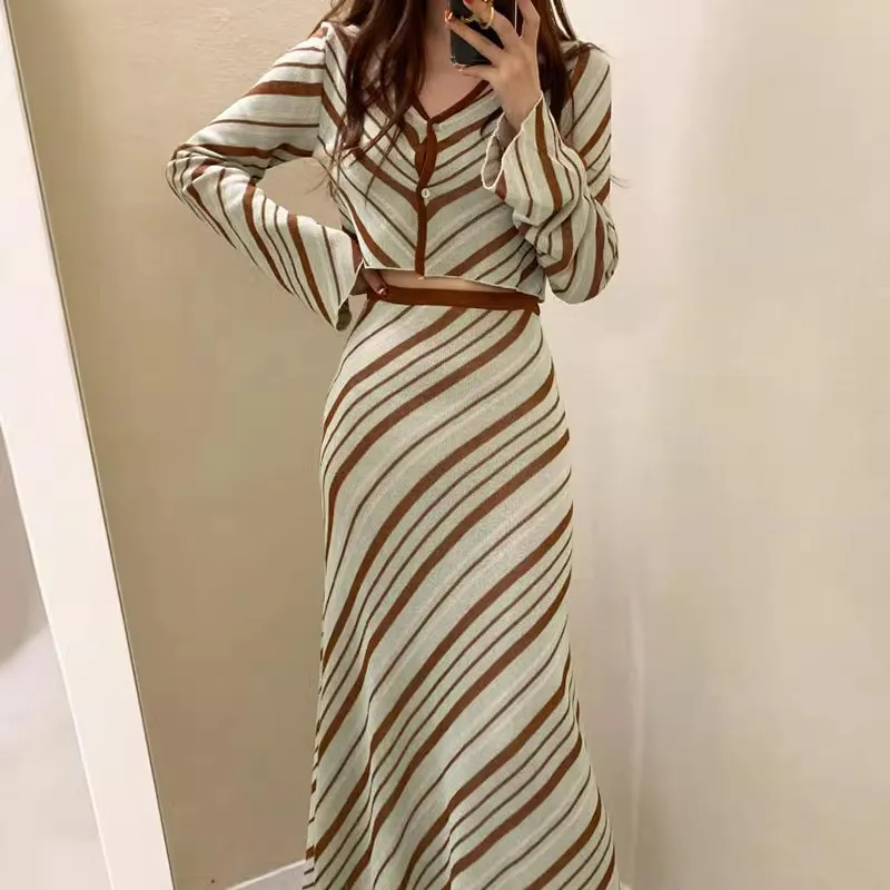 Crafted from soft, stretchy knitwear, this set is designed to provide a flattering fit that hugs your curves while offering flexibility and ease of movement. The high-waisted skirt elongates the legs and accentuates the waist, creating a balanced, feminine silhouette. Available in various colors and patterns, this two-piece suit is both versatile and timeless, making it a must-have for any fashion-forward wardrobe.