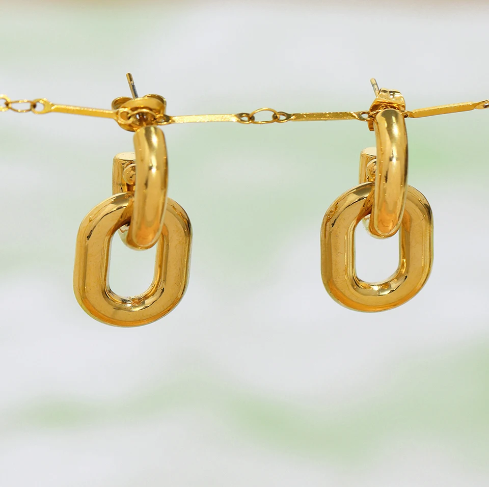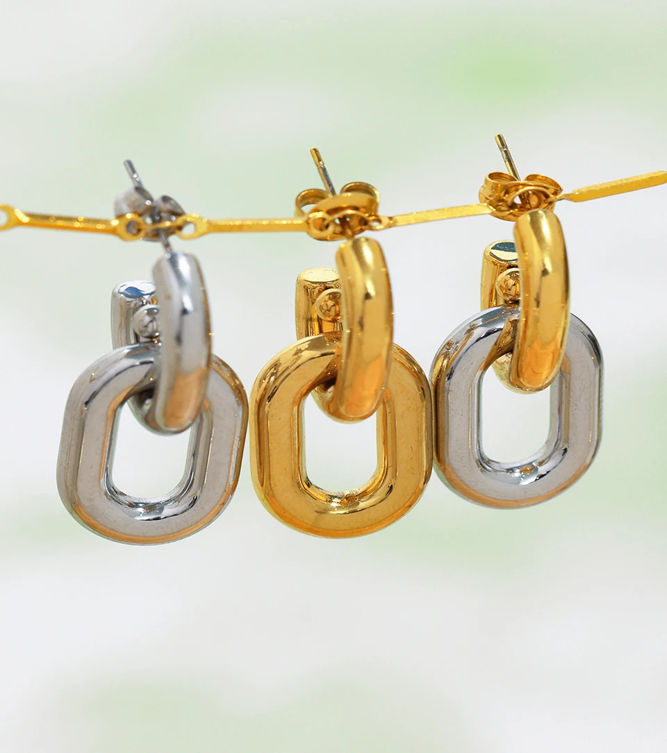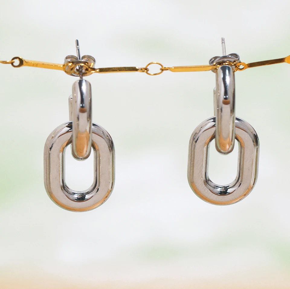 Elevate your accessory game with the Two-Tone Oval Circular Ring Dangle Earrings. Crafted from stainless steel with a luxurious 18K gold plating, these earrings offer a striking design with long-lasting durability. The waterproof, non-tarnish finish ensures they remain beautiful with minimal maintenance, while the dangle hoop style offers both comfort and elegance.