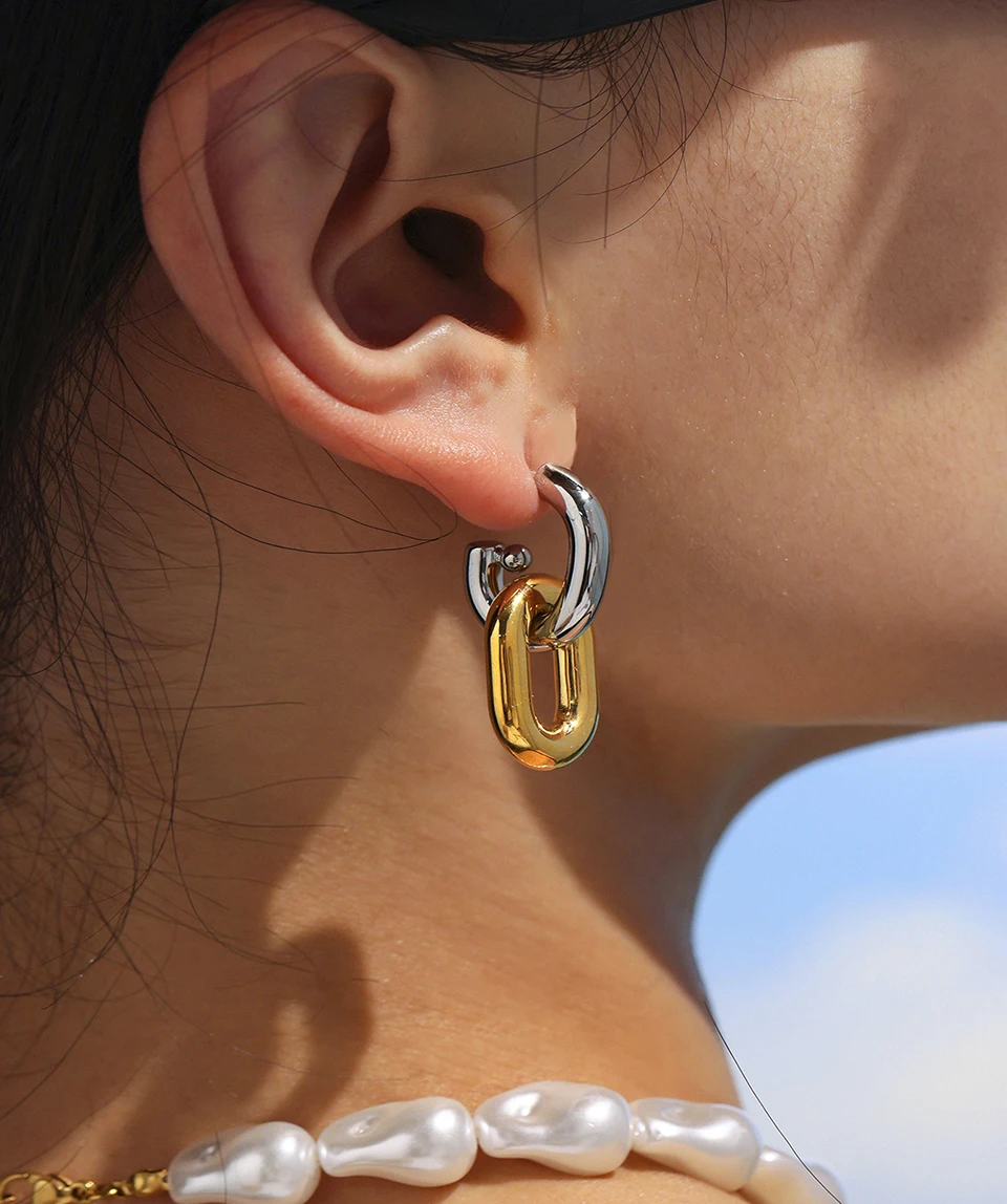 Make a stylish statement with these Two-Tone Oval Circular Ring Dangle Earrings. Designed for women who love combining elegance and modern style, these earrings feature a unique two-tone design with a blend of stainless steel and 18K gold plating. The oval circular rings and dangle design offer a sophisticated yet bold aesthetic that will complement both casual and formal outfits.