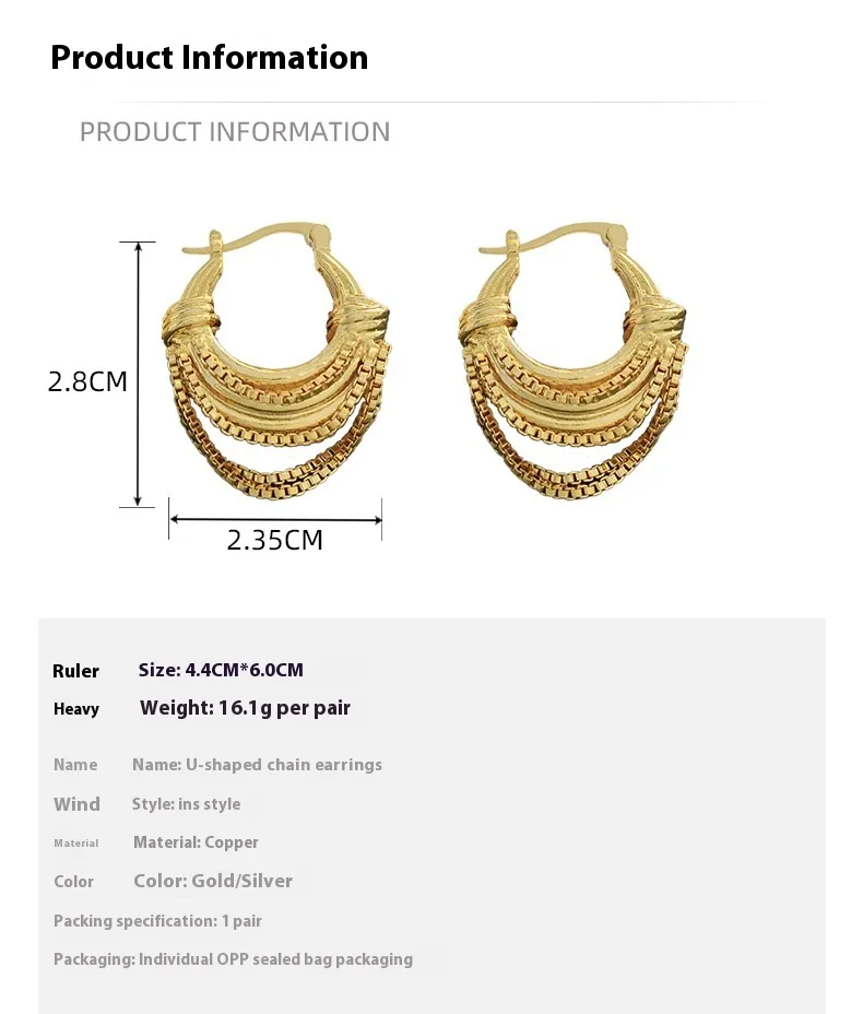U-shaped Chain Brass Plated 18K Real Gold Earrings
