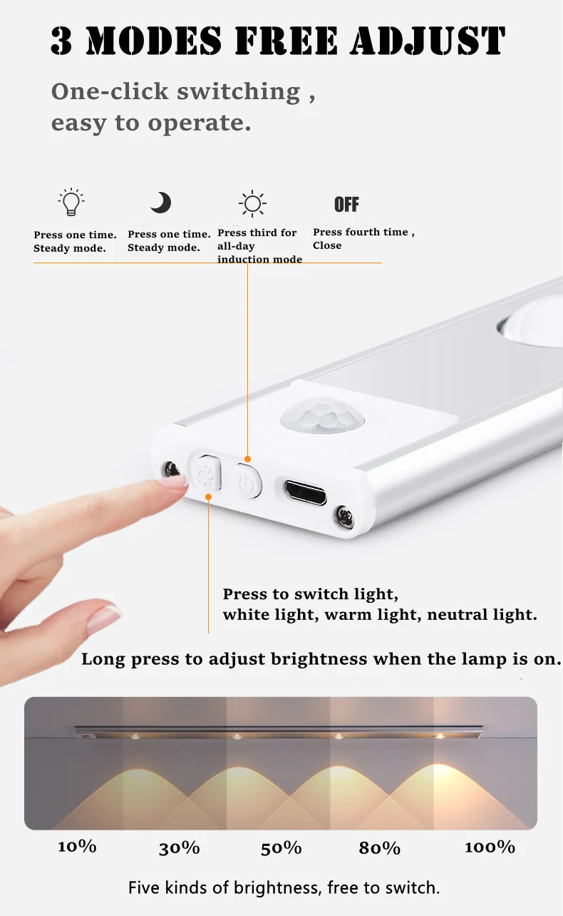 â¤ï¸ã€3 Working Modes Adjustable】: These stick on closet lights have a 3 mode switch which is On-Off-G to set it always ON,Off or Motion Sensor mode. Therefore, you can used these closet lights as normal night light for closet/cabinet/drawer or motion sensor light.under G mode and dark environment, these under cabinet lights will automatically senses human motion within 10ft/120°range and shuts off automatically after 25 seconds of no movement.