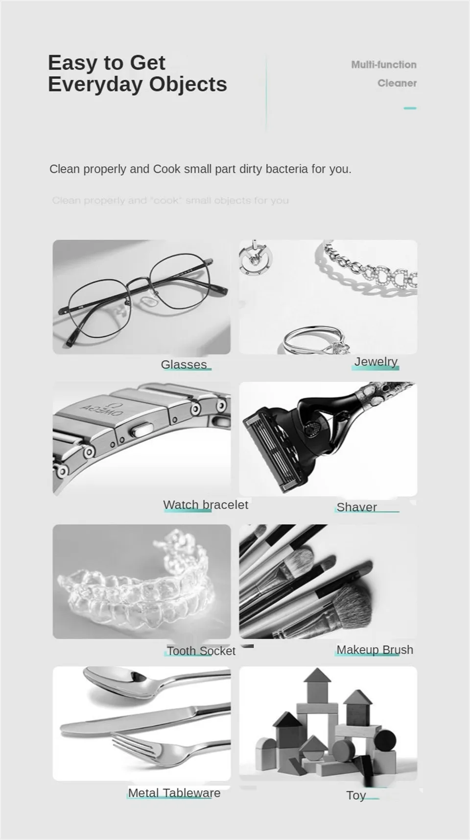 This product is suitable for cleaning glasses, contact lenses, jewelry, watches, makeup tools, children's tableware, razors and other