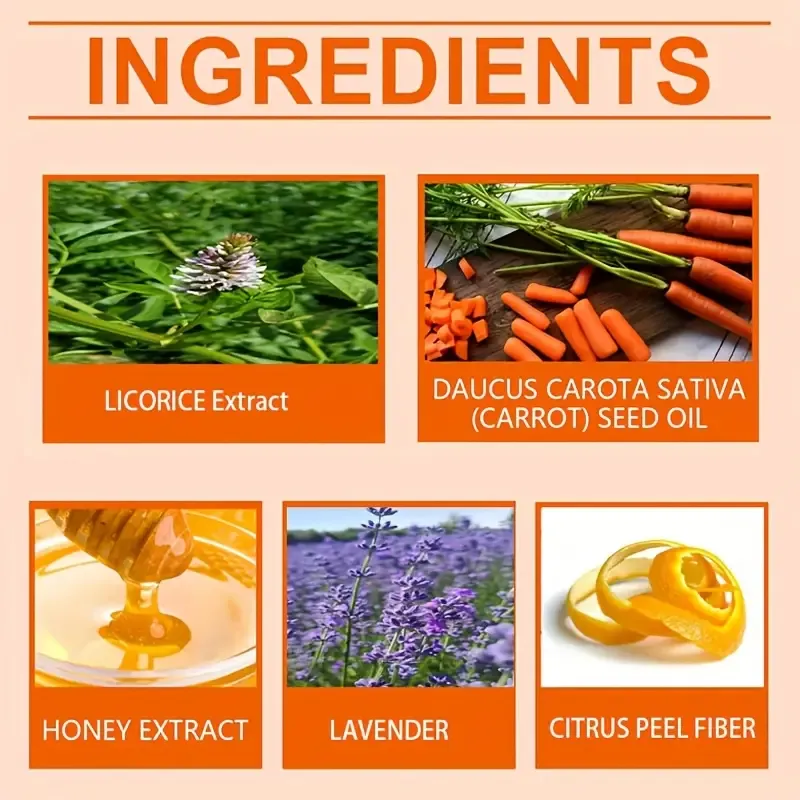 Ingredients:Water, Glycerin, Mineral Oil, Glyceryl Stearate, Triethanolamine, Carbomer, Licorice Root Extract, Carrot Seed Oil, Honey
