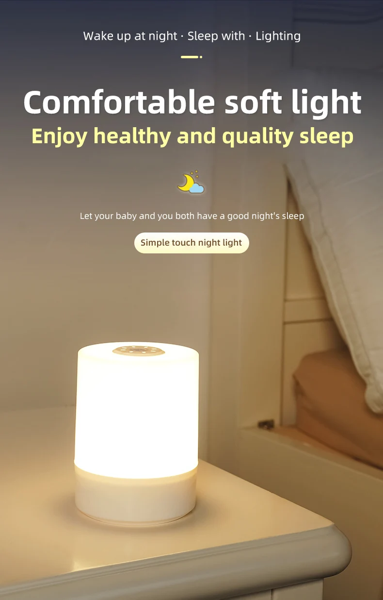 This night lamp is designed to offer versatile lighting solutions with its touch control feature, adjustable brightness, and three color settings. The rechargeable battery provides a cordless and portable lighting option, making it easy to place the lamp in different locations around your home. The lamp includes a convenient switch for turning it on and off, along with touch control for adjusting the color and brightness. The three color settings—warm, neutral, and cool light—allow you to customize the lighting to suit your needs, whether you're using it as a night light, reading lamp, or ambient light.