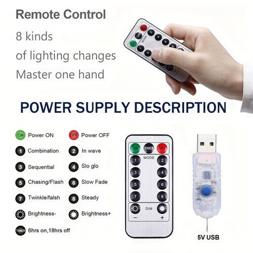 This LED Christmas light set features adjustable 8 lighting modes, giving you full control of brightness and style—from soft glow to flashing, fading, waves, and twinkle effects. The included remote control makes switching modes, adjusting dimming levels, and setting timers easy and convenient.