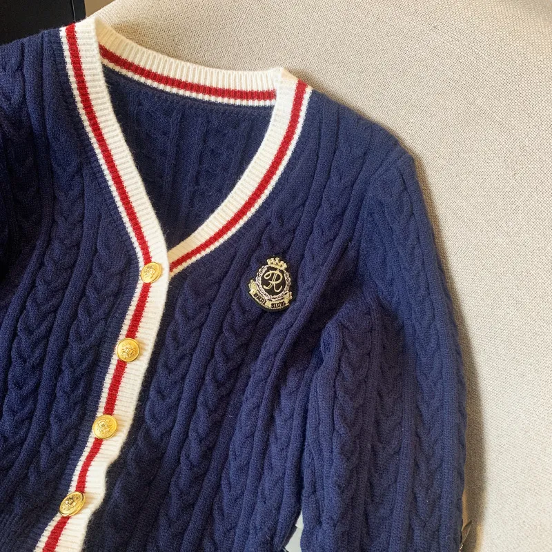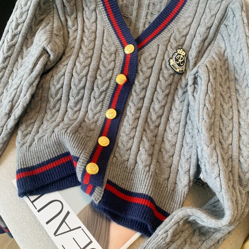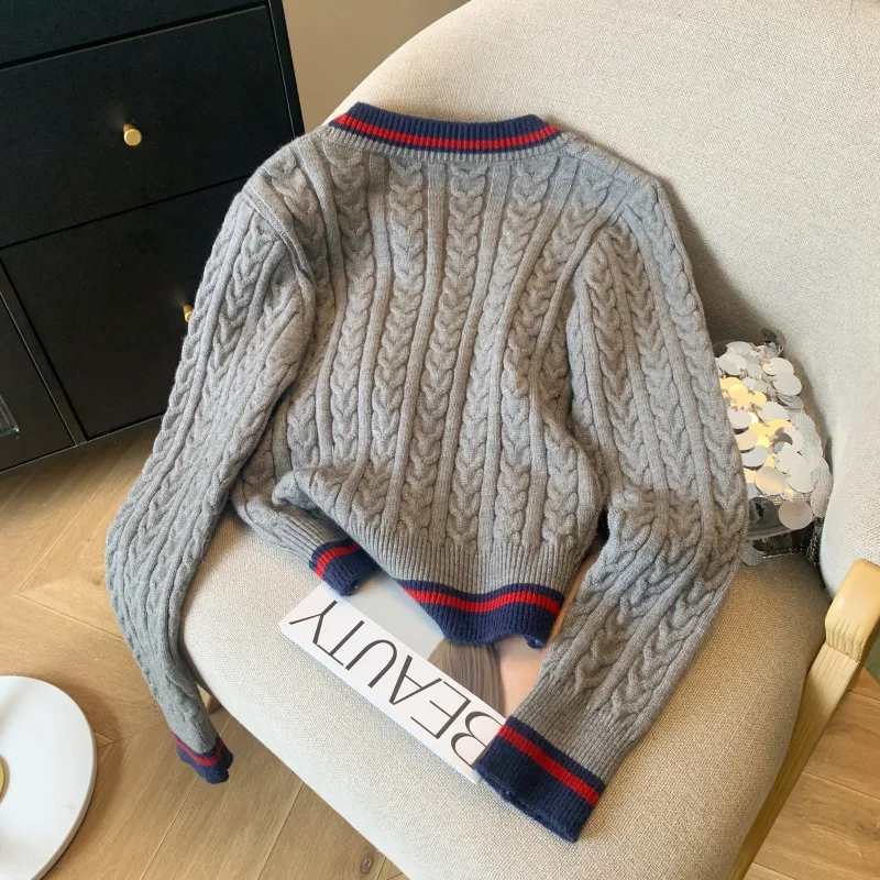 V-collar Contrast Color Knitted Cardigan Waist Slimming Cable-knit Sweater
