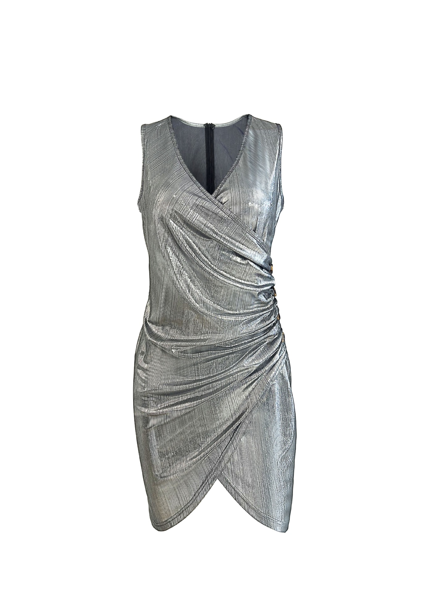 V-neck Casual Color Matching Buttons Solid Color Metallic Dress
