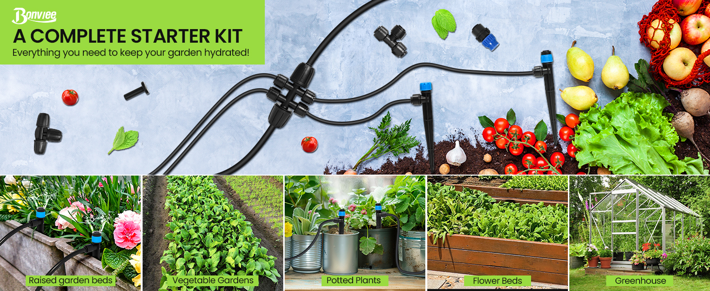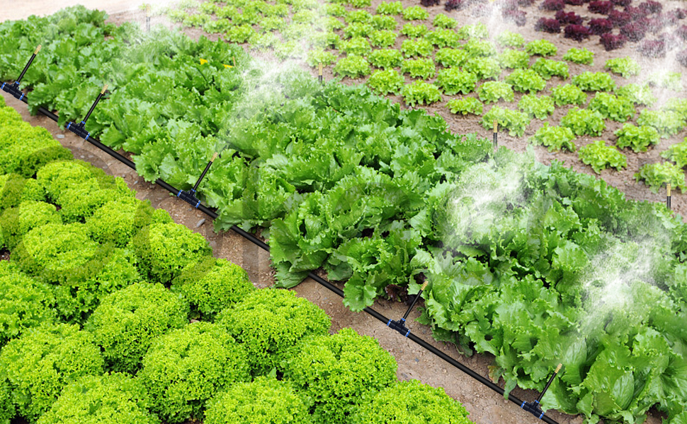 - WIDE APPLICATION: Automatic irrigation kit designed for a variety of outdoor spaces, it's great for atomization, lawn irrigation, patios, roof cooling,agriculture, vegetable , greenhouse, flower bed, swimming pool misting fog cooling irrigation etc. This new drip irrigation kit can help your well-maintained garden as an all-in-one solution