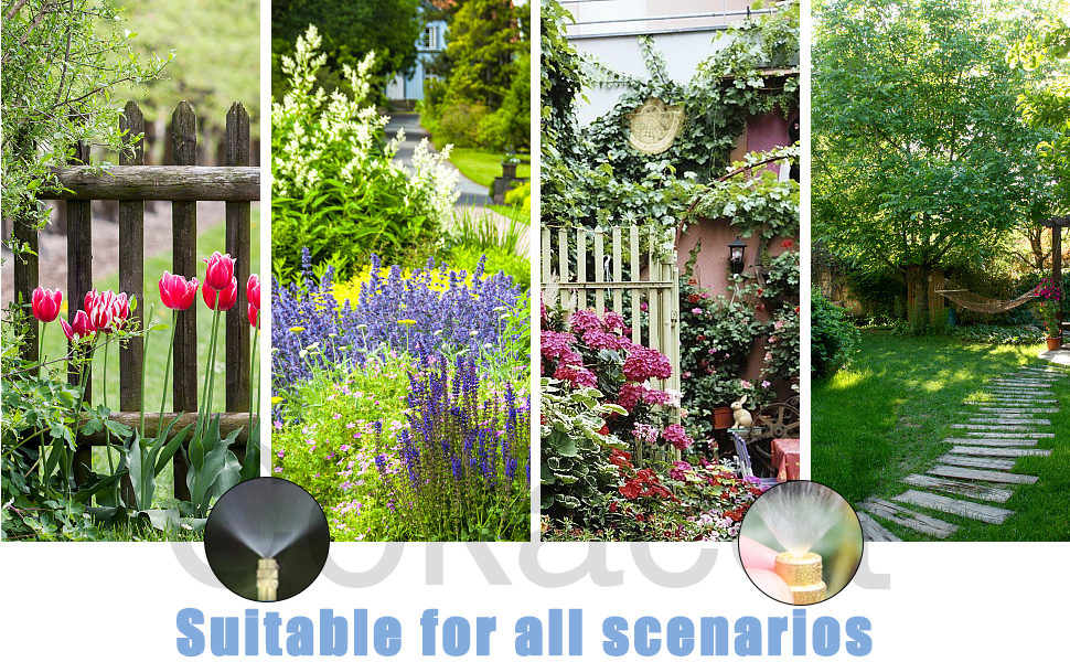 - 3 Adjustable Modes of Water Pressure - Cokacot 49.21Ft adjustable mist garden watering system can save over 70% of water thanks to its adjustable brass misting nozzles which can spray right water according to your different needs in 3 modes-small, medium and large.