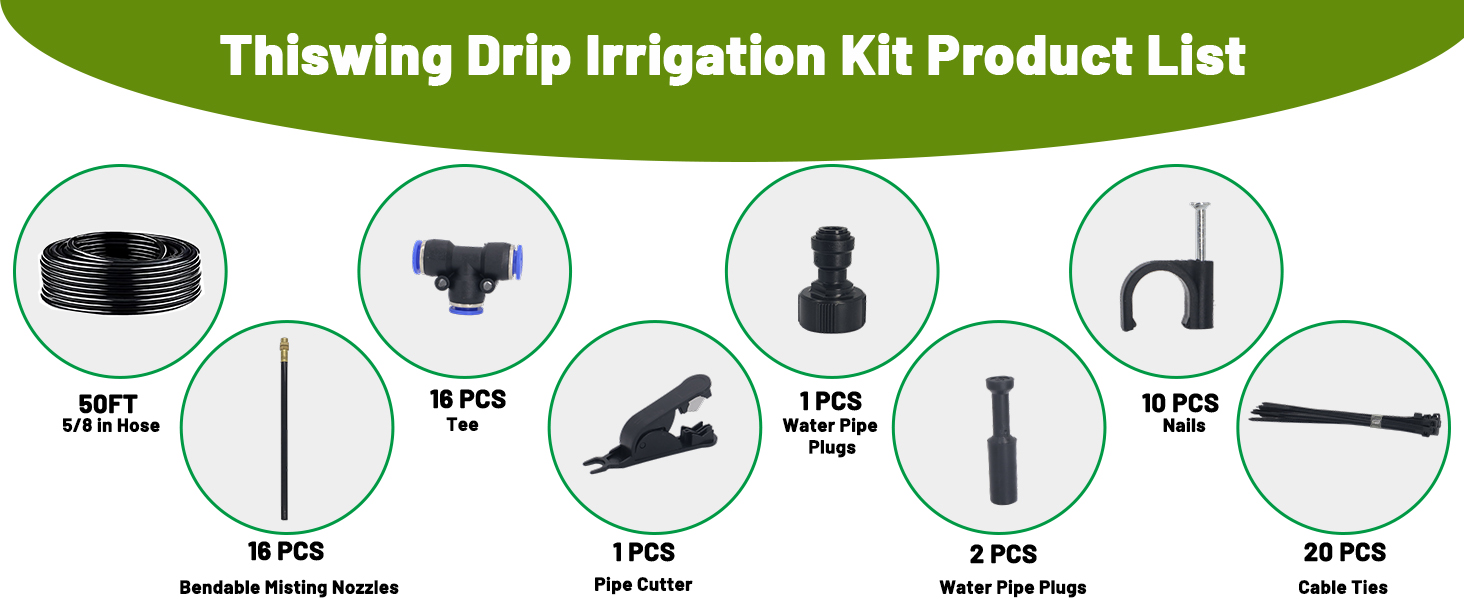 Drip Tape- GARDEN IRRIGATION SYSTEM: Drip irrigation system including 50FT 5/8 in hose, 16Pcs 360° bendable misting nozzles, 16pcs 5/8 in Tee, 1pcs quick connector, 2 pcs water pipe plugs, 1 pcs replacement core, pipe cutter, a bag of fixing nails and a bundle of cable ties. Everything you need is included in this irrigation system