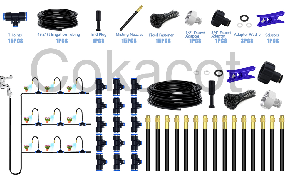- Upgraded Misting Irrigation System - Cokacot 49.21Ft 8mm drip irrigation tubing system kit with upgraded brass misting nozzles and T-joints has better performance in anti-leaking and connection, the irrigation kit also comes with upgraded 1/2 inch and 3/4 inch faucet adapter with filter net for blocking impurities.