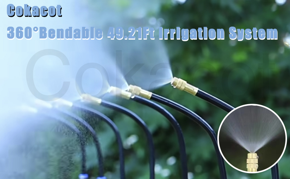 - Bendable in 360° and In Any Direction - This bendable misting irrigation system with Irrigation Tubing allows you to bend its misting nozzles to any direction in 360 degree. Cokacot prepared 10 fix stems help you to fix it on ground or above ground, you may also just hang this misting system kit to fence and no need fixed stems.